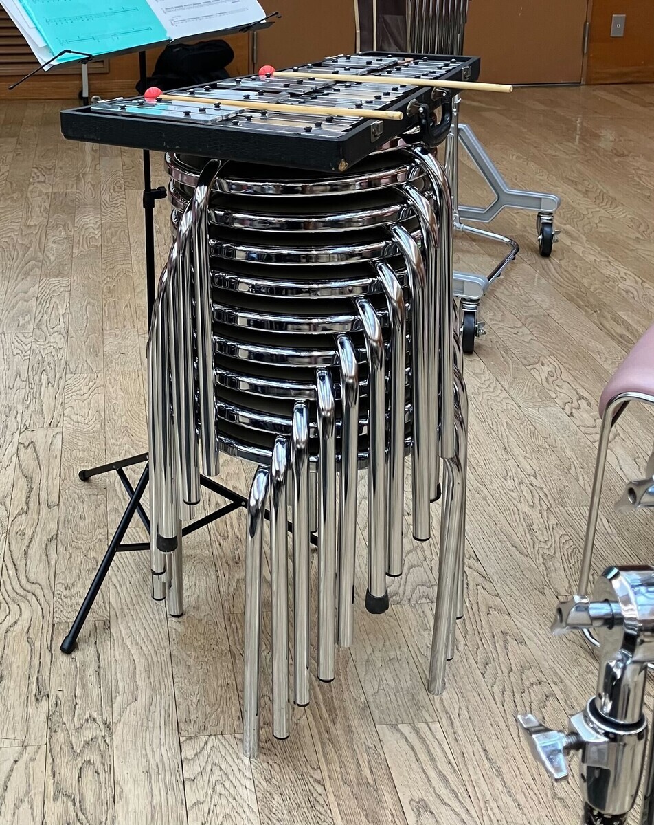 大量の椅子をグロッケンのスタンドがわりにしています。安定性とちょうど良い高さを求めた結果この形に辿り着きました。